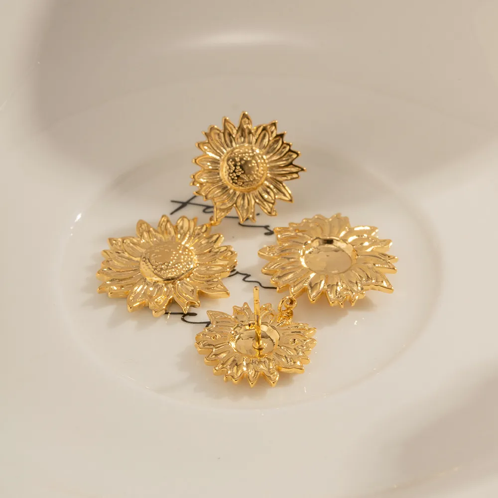 Gold Earrings Vintage Metal Sunflower