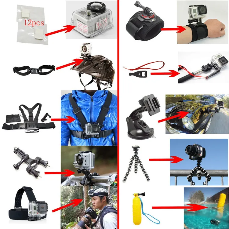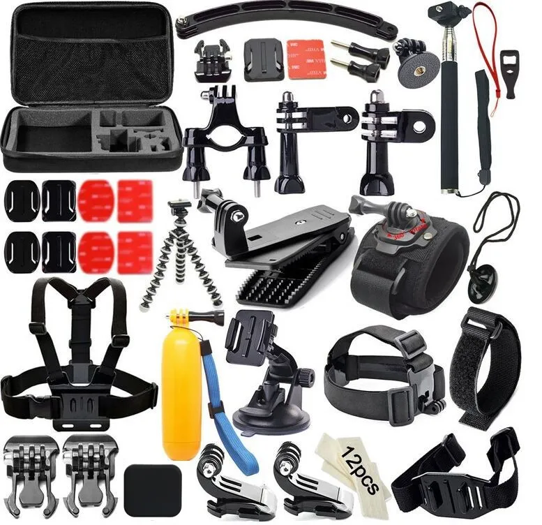 Package product list:1x EVA large camera bag, 1x chest strap, 1x one rubber strap, 1x selfie stick, 1x buoyancy lever, 1x 360 degree wrist strap, 1x suction cup, 1x helmet strap, 1x bicycle bracket + three-way adjustment arm, 1x 360 degrees Backpack clip, 1x magic strap, 1x octopus tripod, 1x helmet extension kit, 2x movable base, 1x flat arc base 3M glue 8 piece set, 12x anti-fog sheet, 2x J-seat, 1x plastic wrench, Gopro3 lens cover , 2x long screw, 1x short screw, 1x tripod adapter, 1x safety buckle + 3 glue.