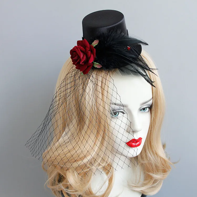 Gothic Punk Vintage Red Rose Feather Mesh Head Accessories