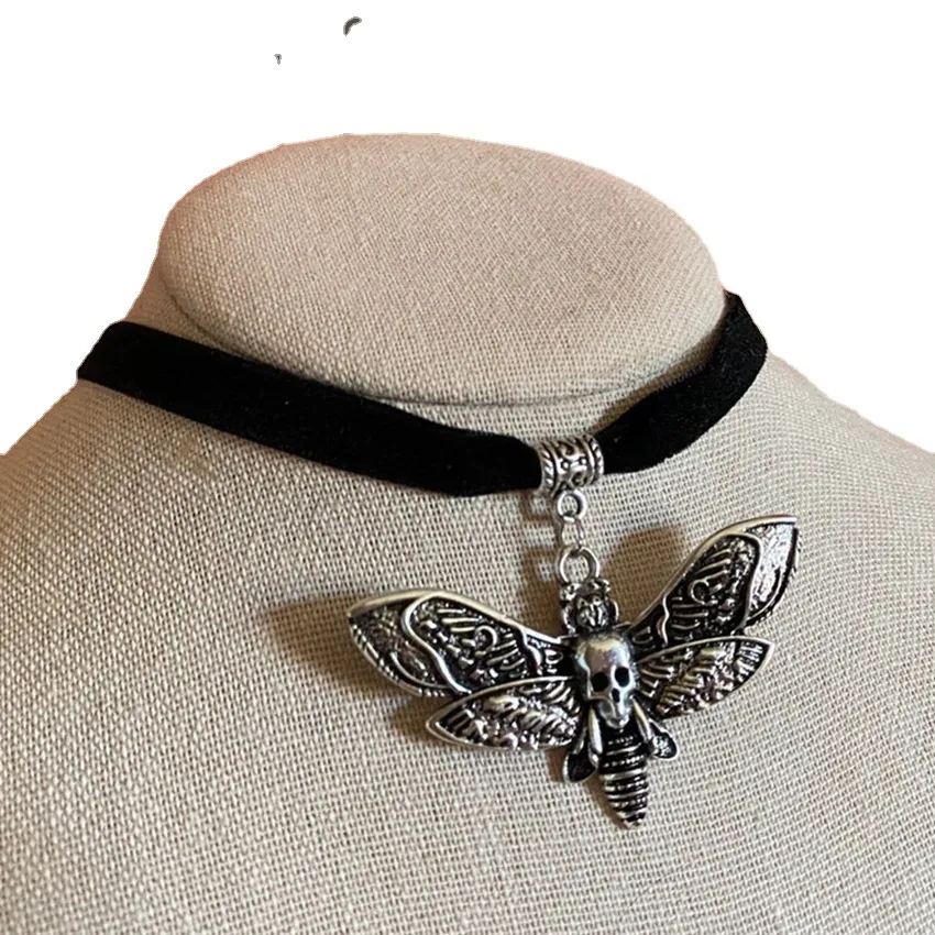 Gothic Silver Skull Moth Pendant Necklace