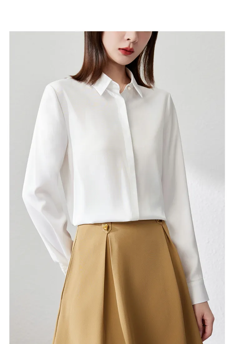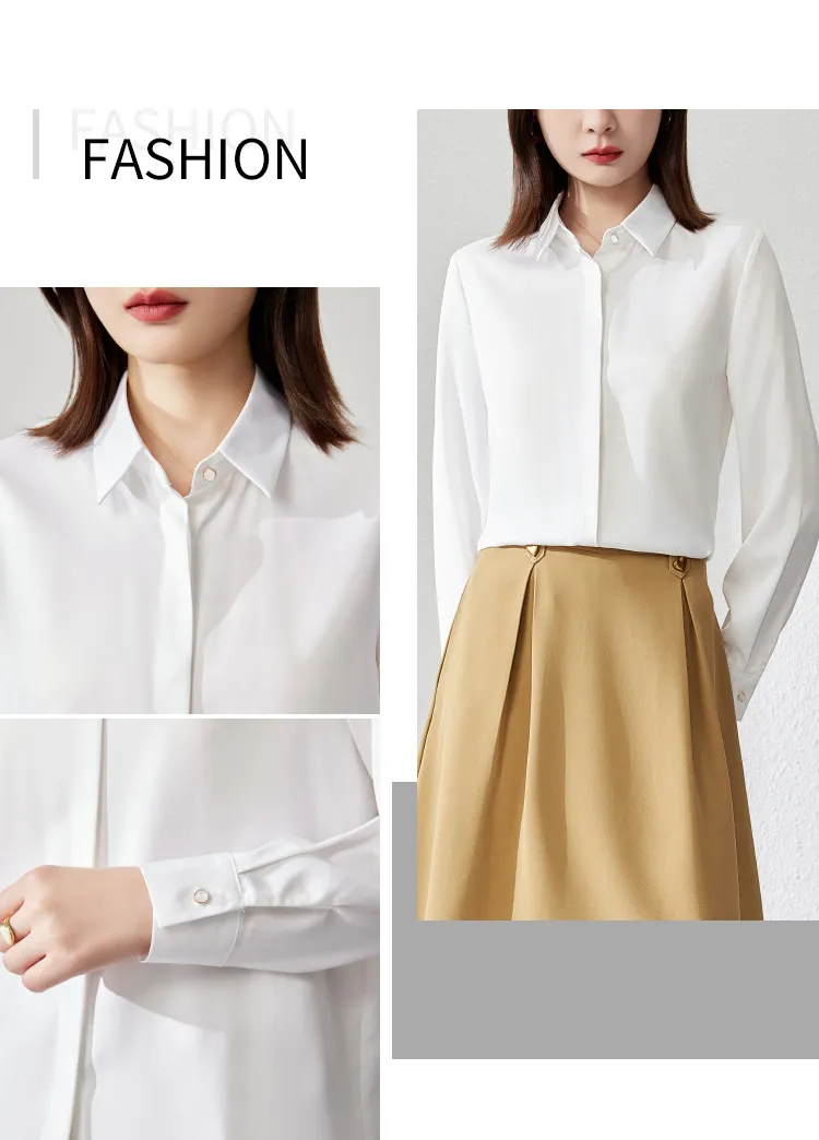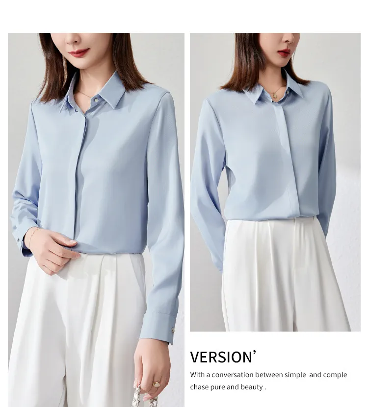 Featuring subtle design elements like fold-over cuffs, button-down front, and a soft turn-down collar, this top is a timeless addition to your office fashion arsenal. It comes in a variety of elegant tones to suit any professional wardrobe, from classic white to soft pastels or bold navy.