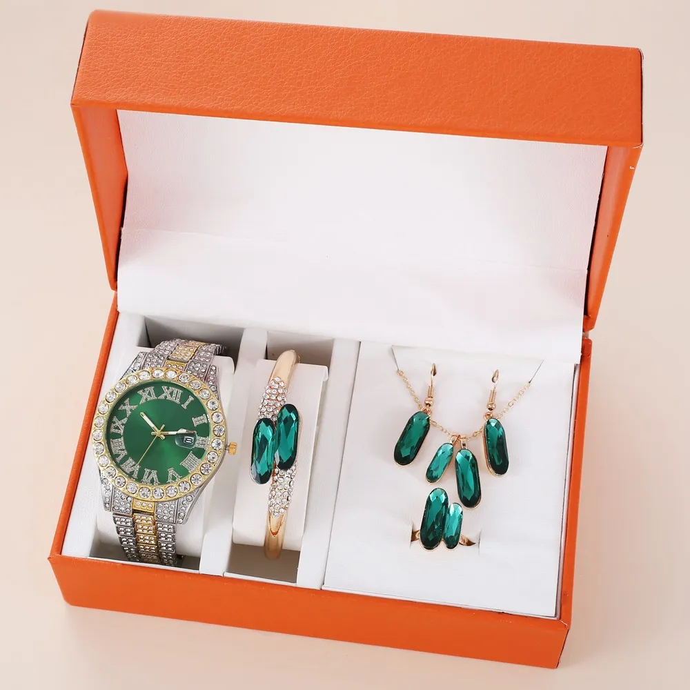 - Complete Matching Set: Includes green steel belt quartz watch, ring, necklace, and earrings.