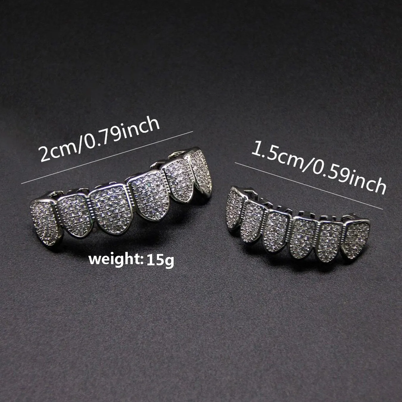 Color: silver six teeth zircon set (no fading), zircon silver upper teeth (no fading), zircon silver lower teeth (no fading), gold zircon