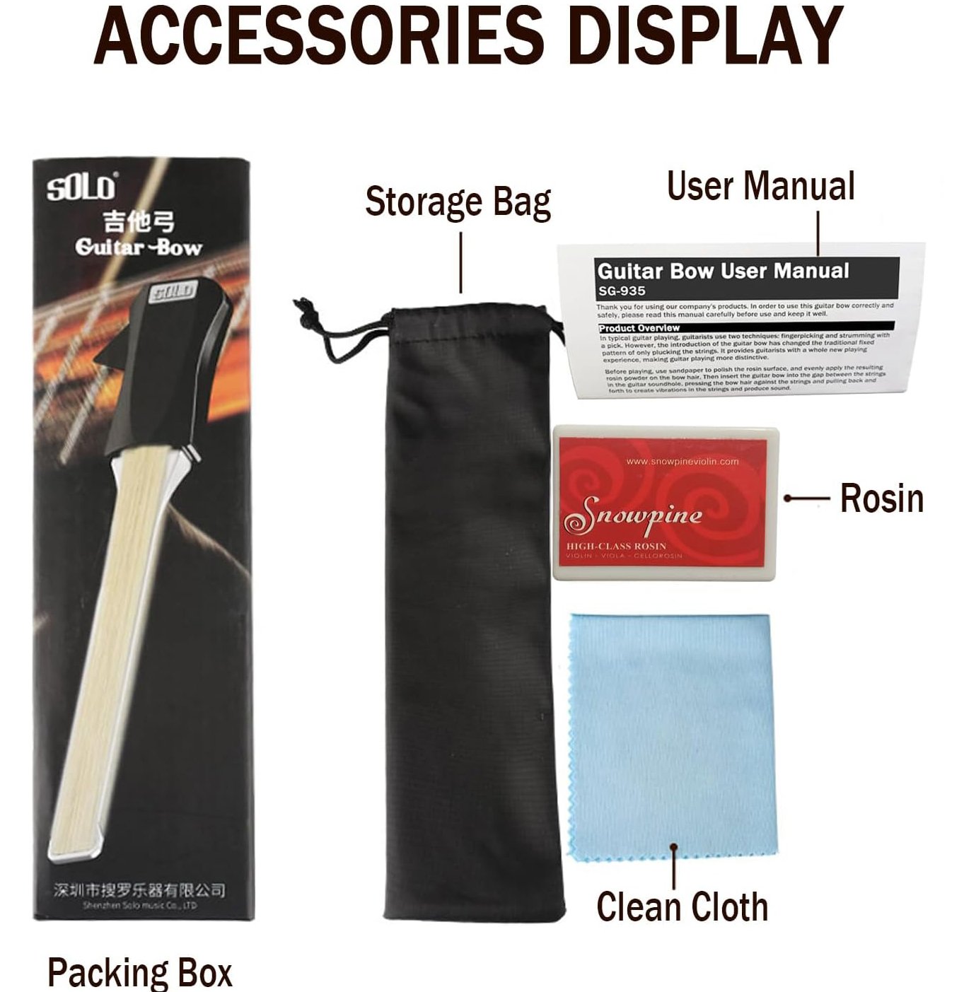 understand how to play it within minutes. Comes with a guitar bow bag, a box of rosin, a cleaning cloth, a User Manual.