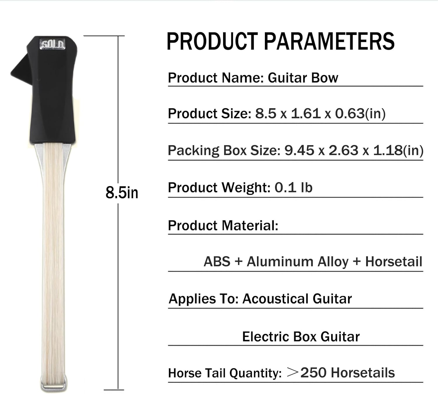 The guitar playing bow is 8.5 inches long and weighs only 0.1 pounds, put it into your guitar bag and carry it anywhere. You will