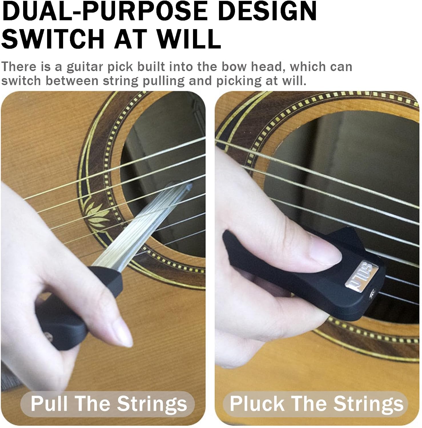 You can play single string or double stings at once as our bow is with hair on both sides. Built-in guitar pick in the handle, allows you to