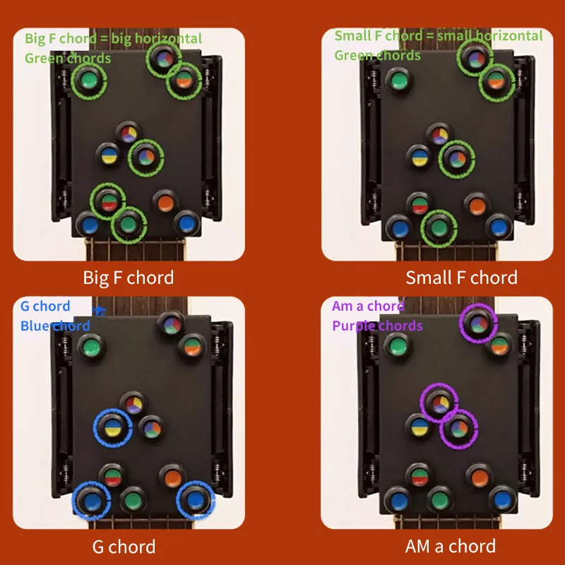 The Chord Buddy uses a color-coded, button-based system to guide your fingers in playing chords accurately. By pressing the buttons, you’ll be able to play chords with ease, while slowly building the strength and confidence needed to play without assistance. This system makes it simple to remember chord shapes, enabling you to play songs right away without the frustration that often accompanies traditional learning methods.