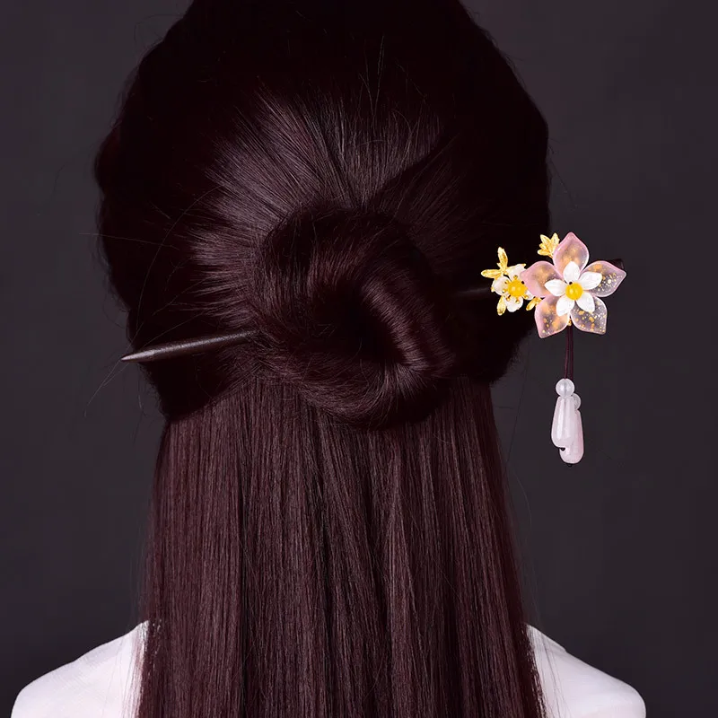 Material: colored glaze, synthetic flower, pink crystal, alloy, wooden pole