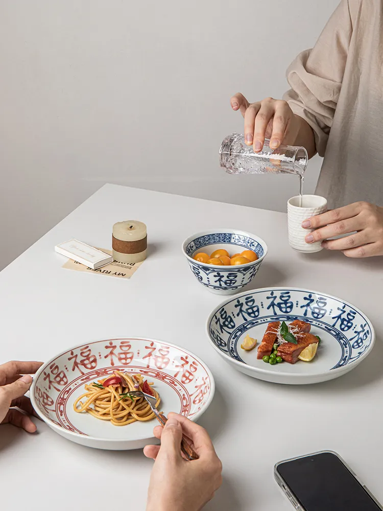 Color classification: fu character Blue-8 inch round deep plates, Fu character Red-8 inch round deep plates