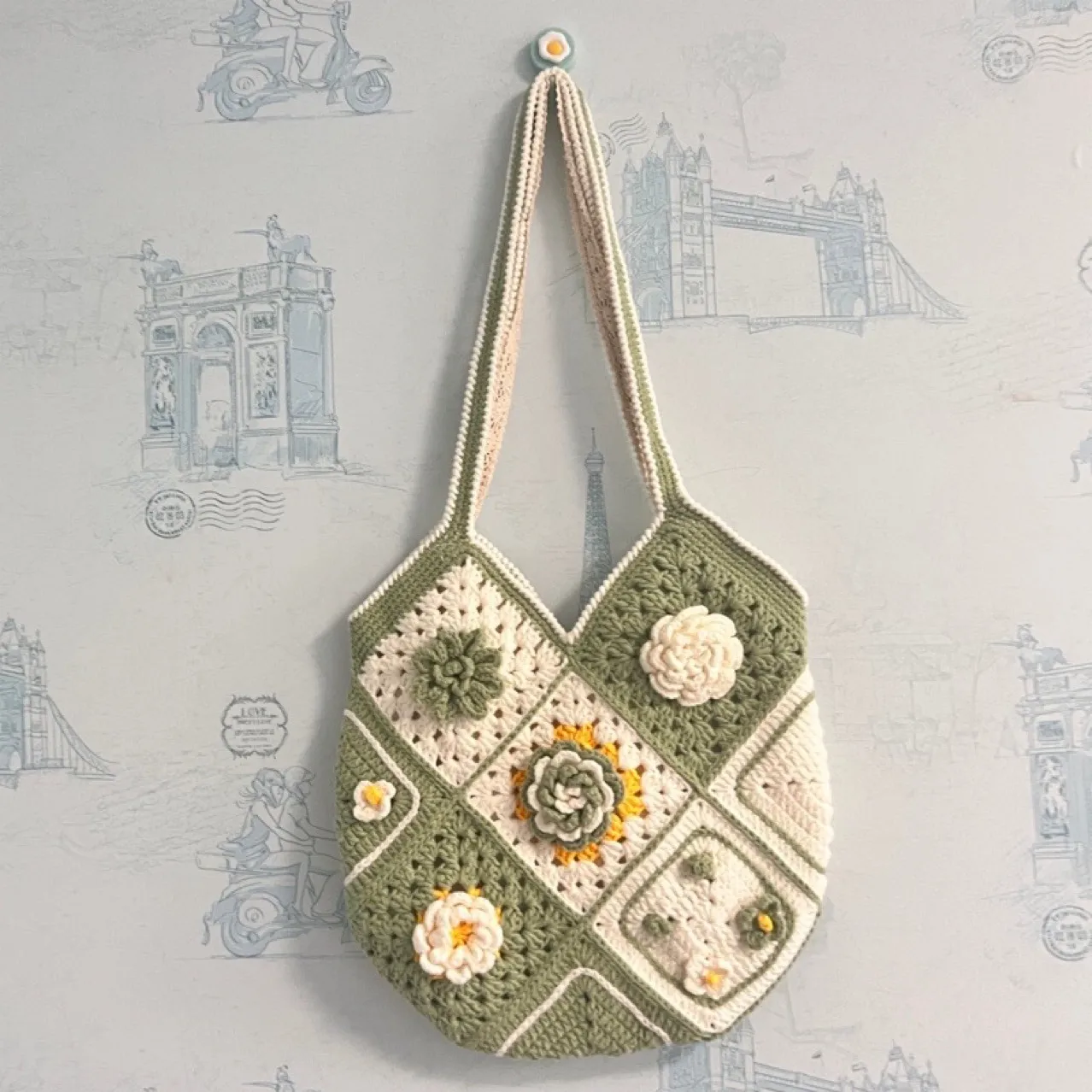 Handmade Knitted Messenger Bag Handmade Wool Crocheted Grandmother Plaid Flower Bag