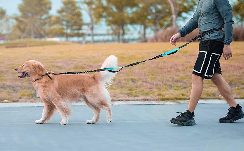 - Double Shock Absorbing Bungee Dog Leash: Equipped with two shock absorbers, our dog running leash efficiently absorbs shock and pull force from dogs up to 150 lbs, reducing stress and muscle strain on both you and your dog. It's an ideal harness accessory, ensuring waist safety and preventing injuries.