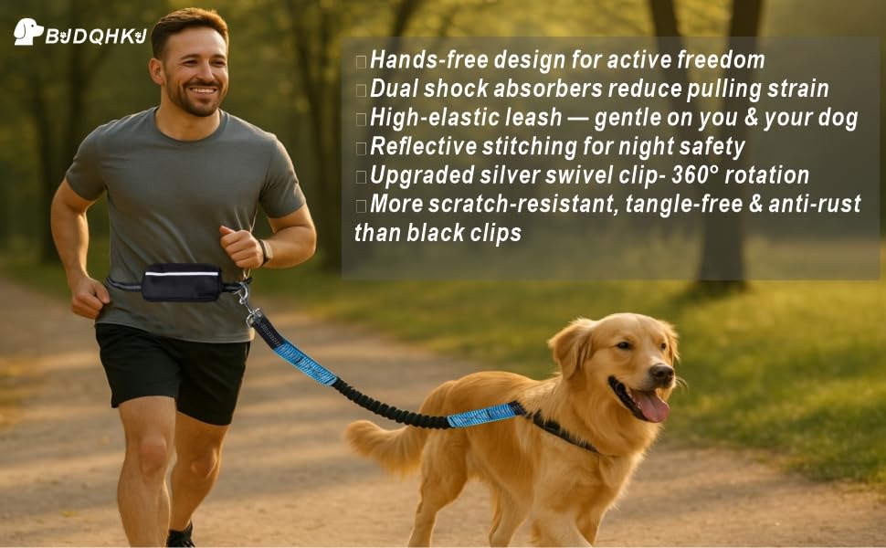 BJDQHKJ Hands-Free Dog Leash Set, designed for medium and large dogs, features dual shock-absorbing elastic with a pulling force of 661 lbs to reduce muscle strain. The large zippered waist pouch and dual-handle design provide convenience for running, walking, and hiking. Reflective stitching ensures nighttime safety, while high-strength nylon and a silver hook offer durability and oxidation resistance. Available in multiple colors, perfect for outdoor adventures.