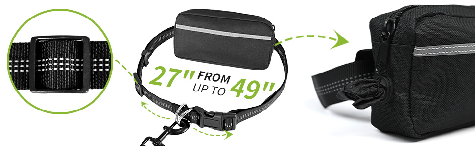 - HANDS FREE DOG LEASH WITH ZIPPER POUCH: Waist belt wearing makes your hands free with your pets. The Durable adjustable waist belt can adjust from 27'' to 55'' which fit for all people. You can freely enjoy your phone, drinking, running and Biking with your dogs