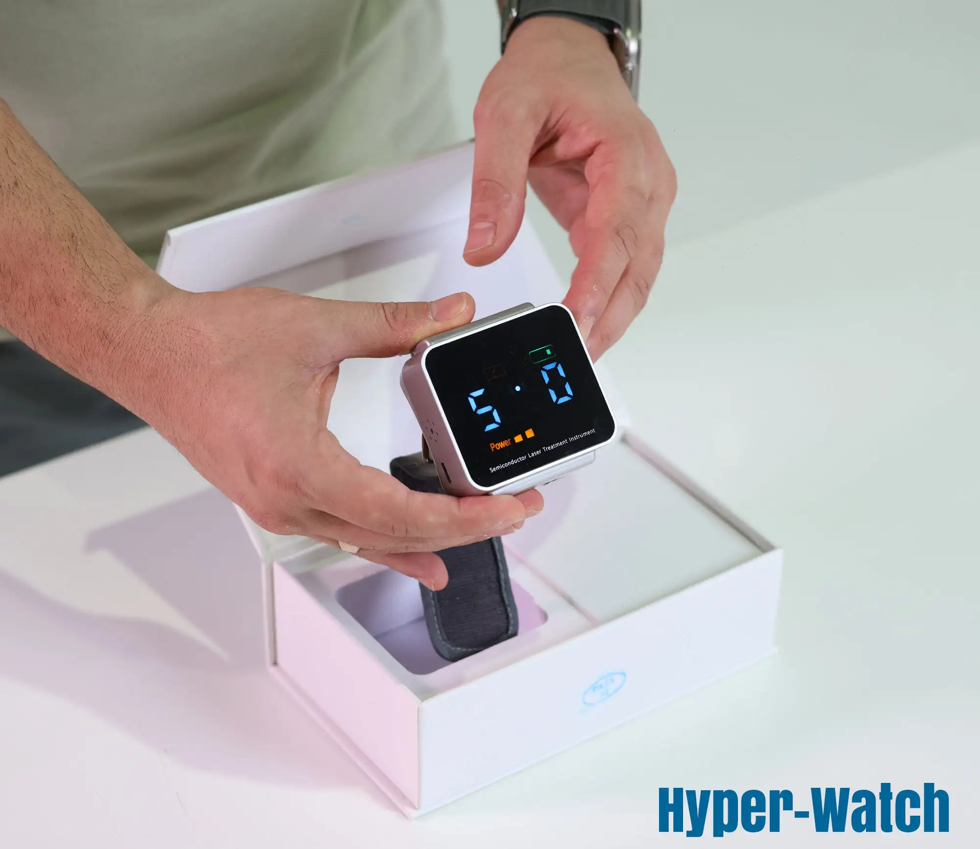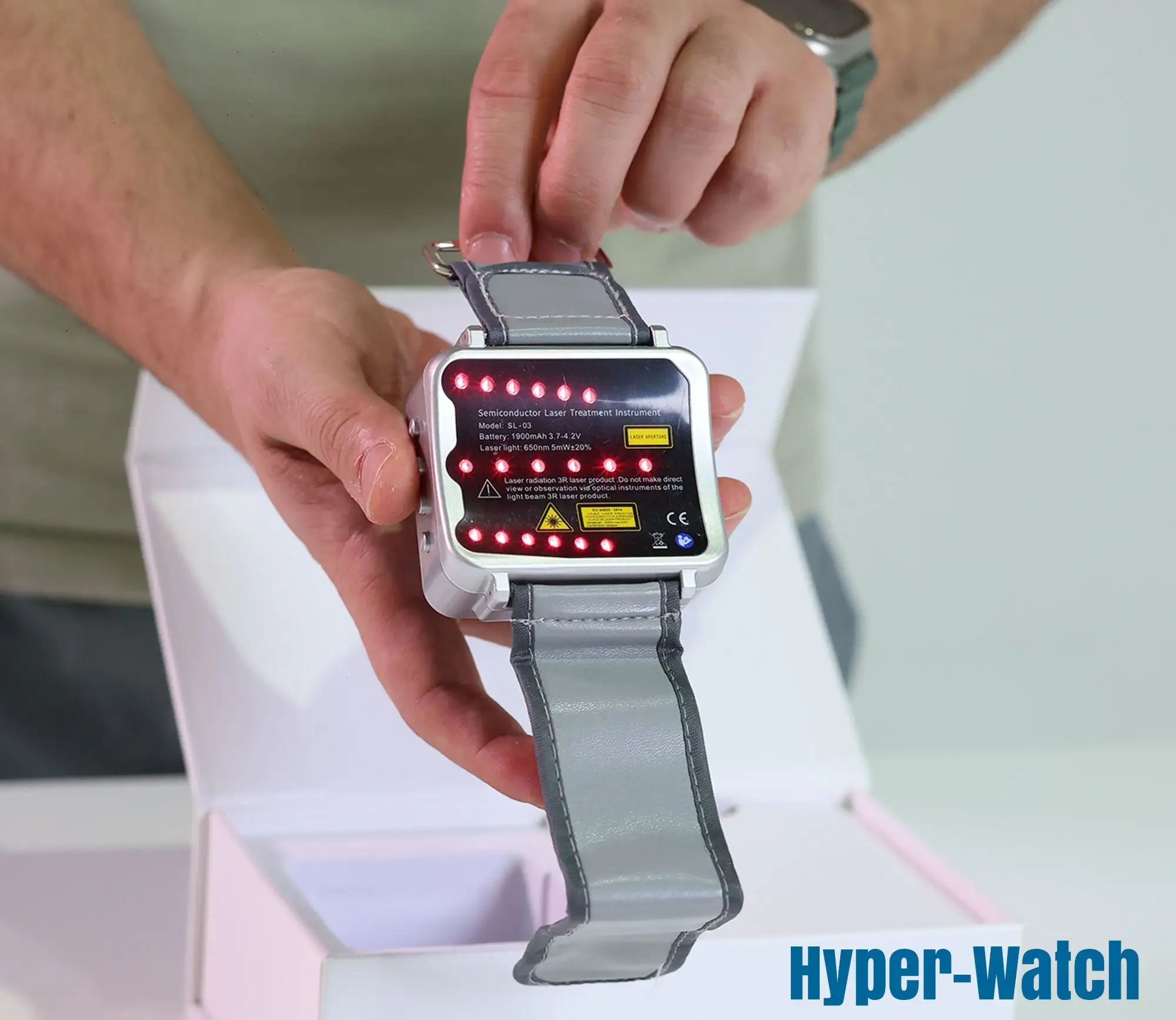 The Hyper-Watch uses low-intensity red light (650nm) applied tocommonly targeted wellness areas on the wrist, a modern take on ageold