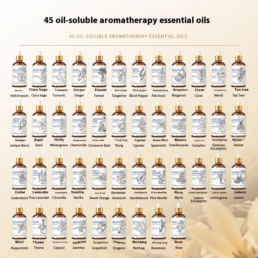 Helichrysum essential oil, Basil oil, Bergamot oil, Black Pepper oil, Cajeput oil, Camphor oil, Cedarwood oil, Chamomile oil, Cinnamon oil,
