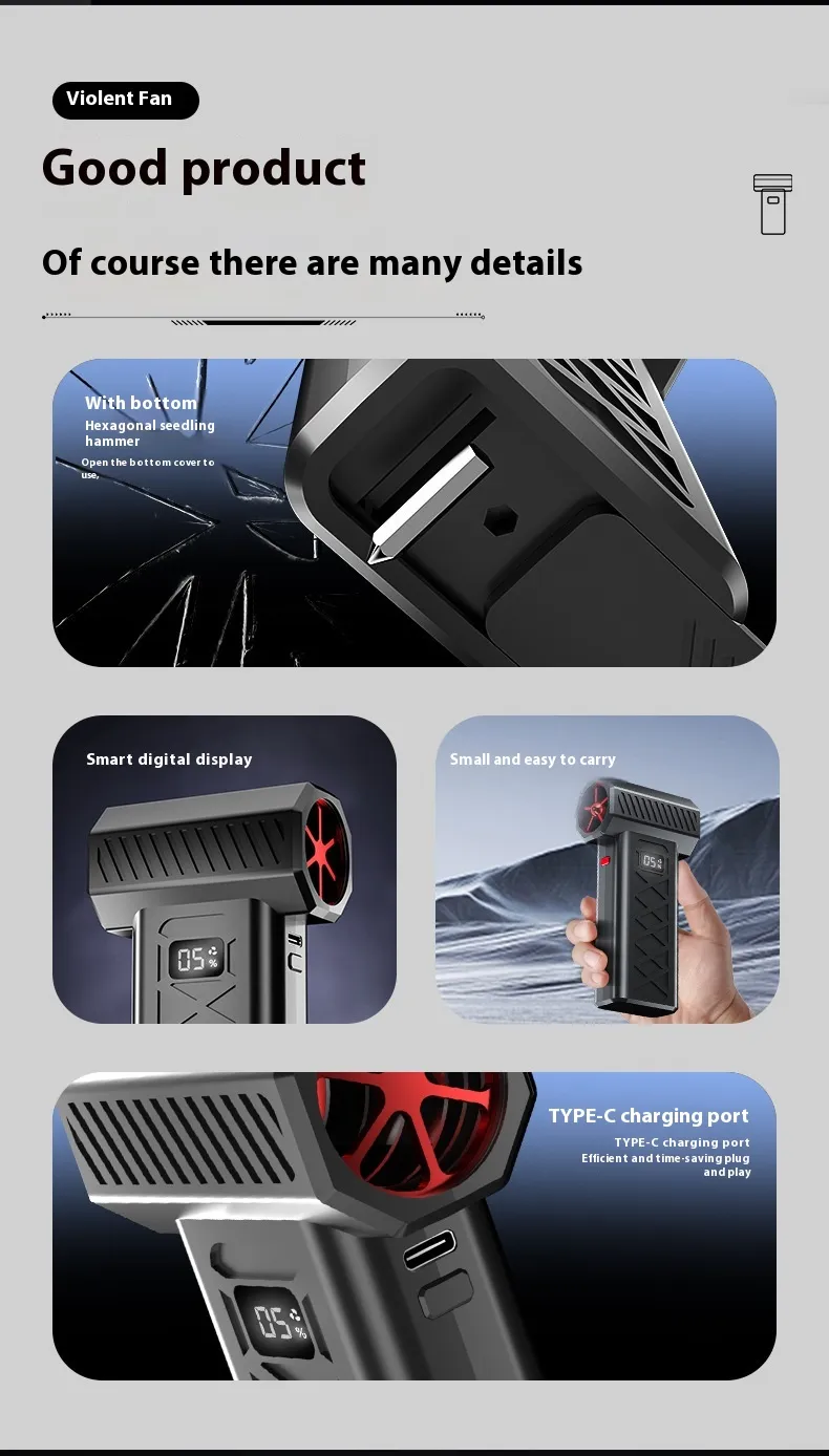 Suitable for drivers, campers, DIY users, and safety-conscious families, the High-power High-speed Turbine Dust Removal Snow Blowing Emergency Lighting Rescue Broken Window Hammer Fan is a smart multi-purpose tool that combines cleaning power, lighting, and rescue capabilities in one reliable device.
