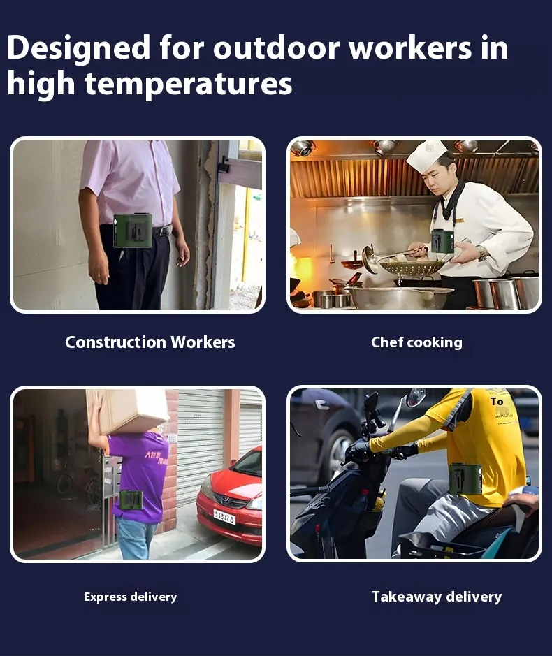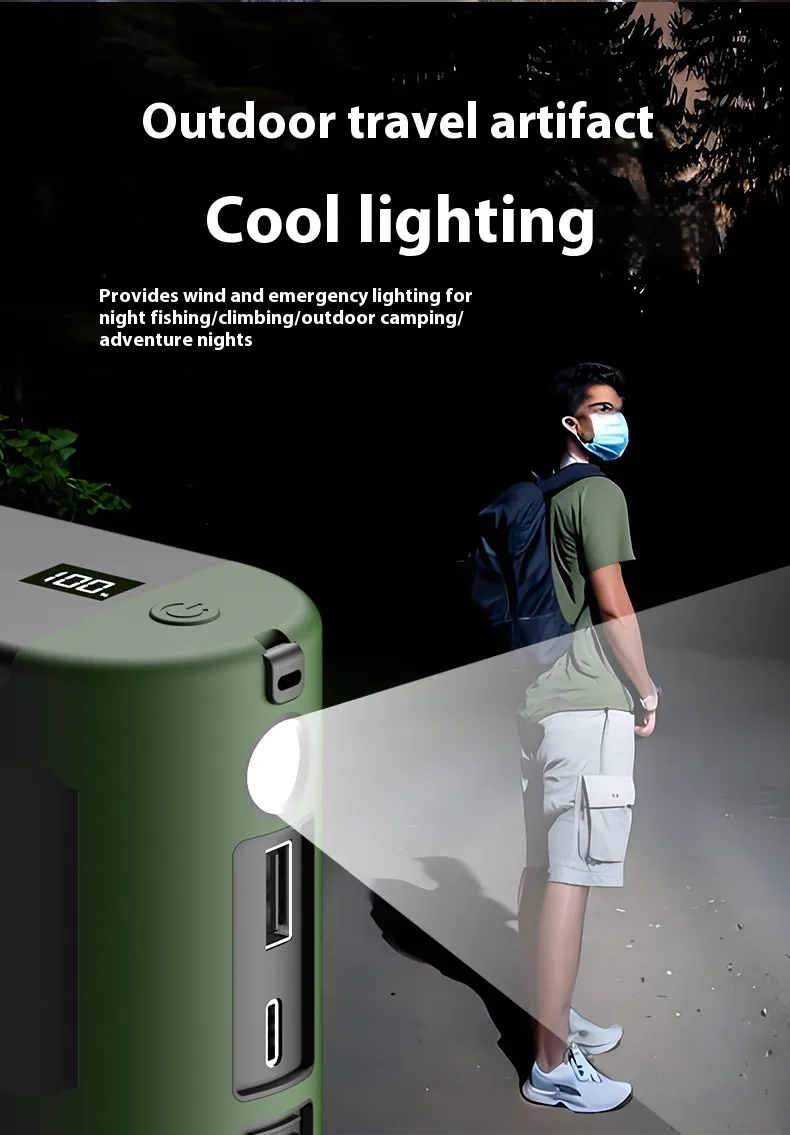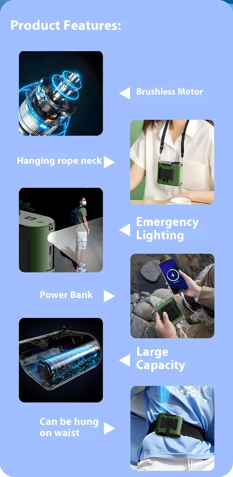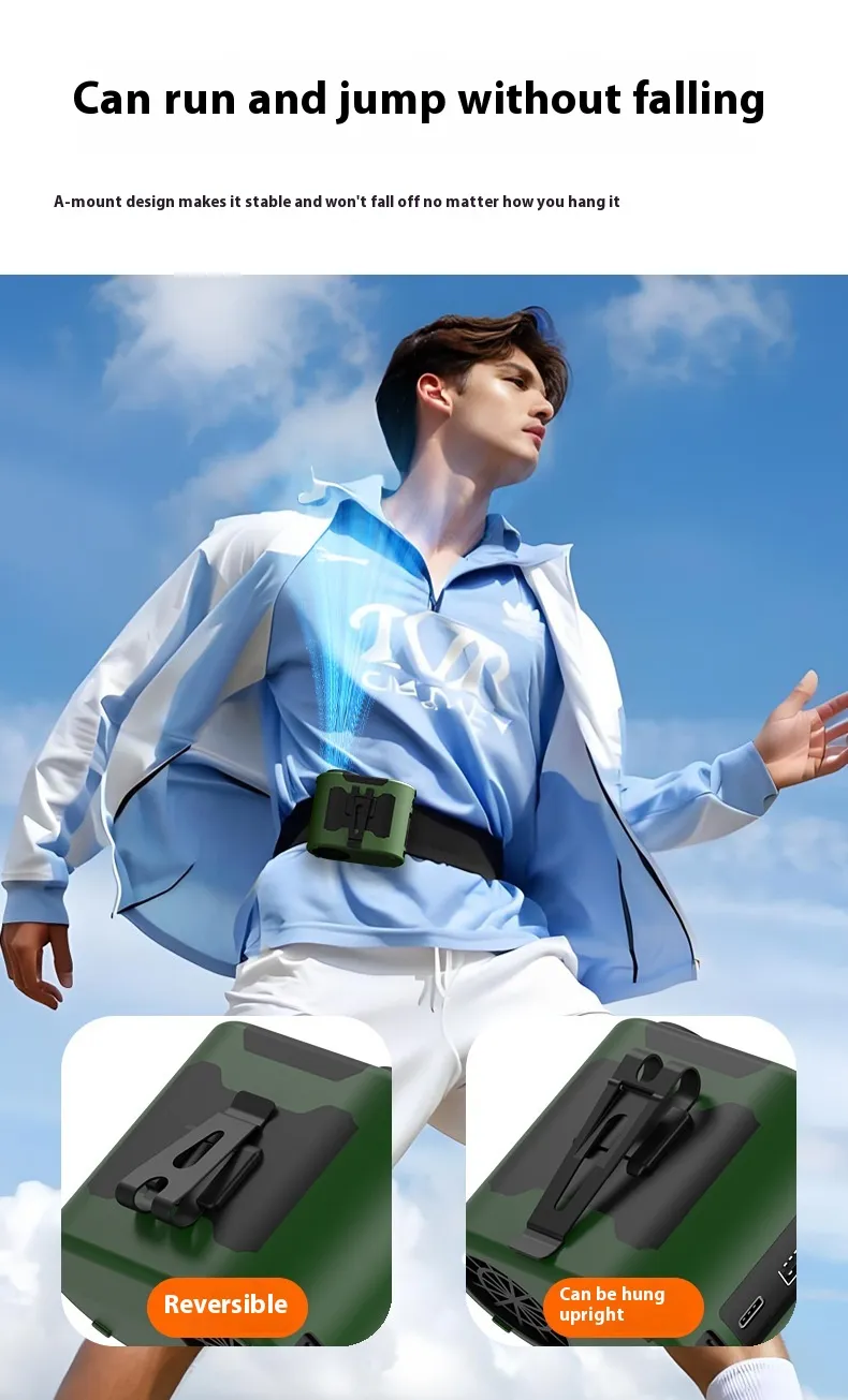 Designed as a waist-mounted halter fan, it is lightweight, adjustable, and easy to wear. The ergonomic design allows comfortable movement while keeping your hands free for hiking, cooking, or setting up tents. Its portable build makes it ideal for camping, outdoor sports, or daily use in warm conditions.
