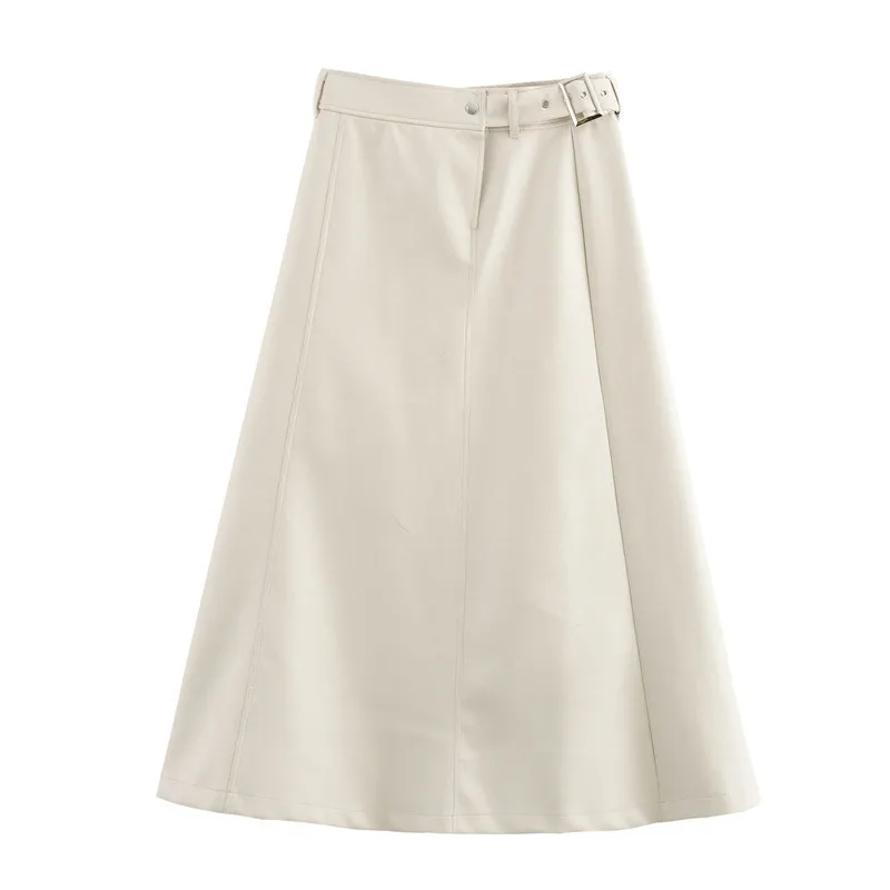 High Waist Pure Color with Belt A-Line Faux Leather Midi Skirt – Chic, Stylish, and Versatile