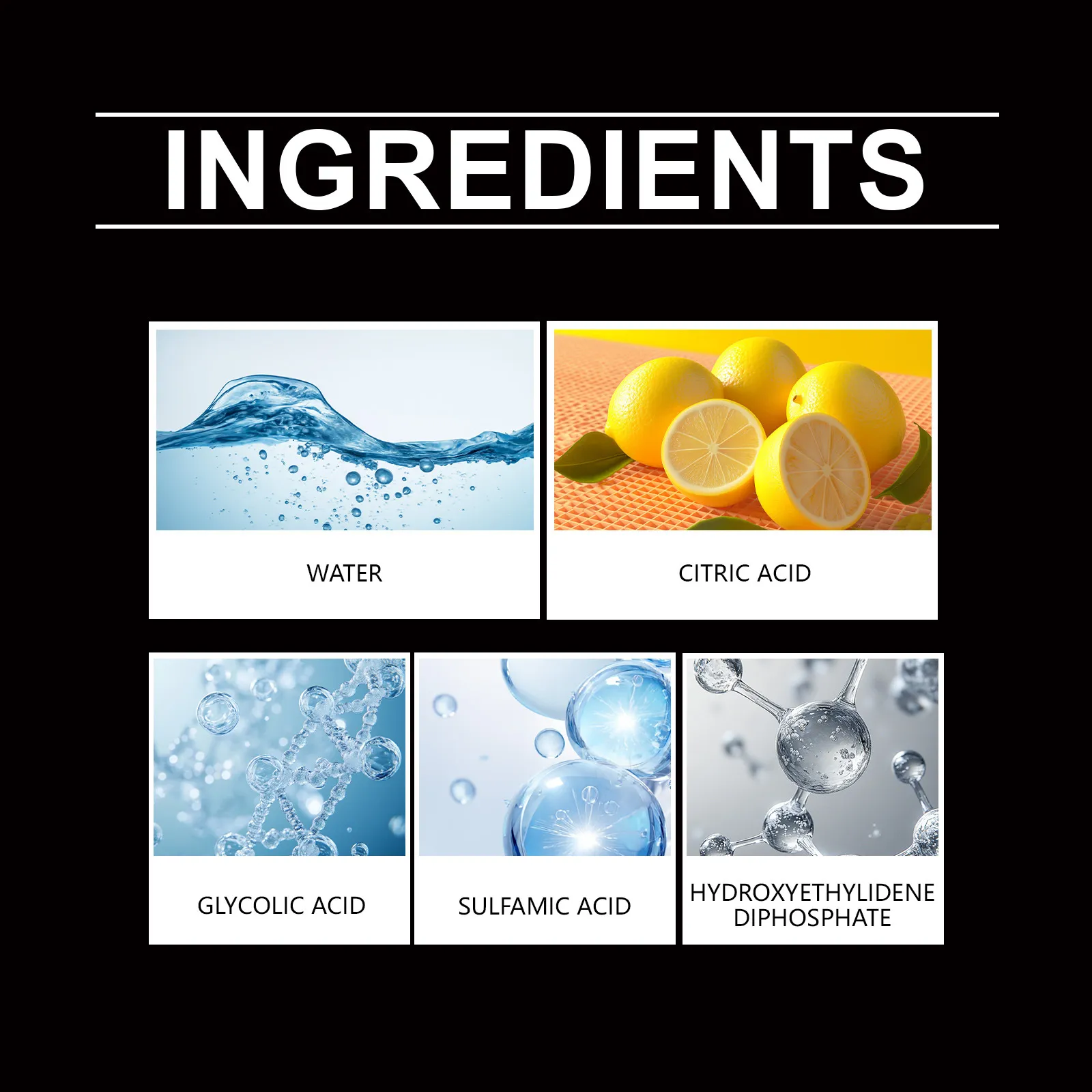 Ingredients: water, citric acid, sulfamic acid, glycolic acid and hydroxyethylidene diphosphate.