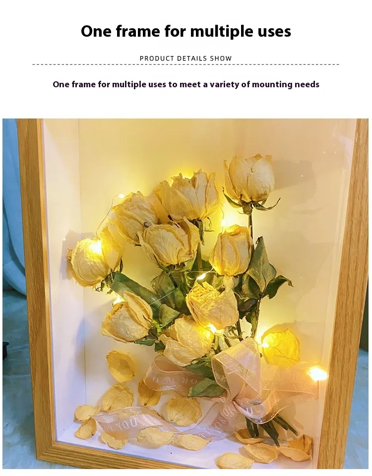 Crafted with care and attention to detail, this hollow frame incorporates preserved flowers in a way that brings nature indoors. It's not only an excellent table decoration but also serves as a wonderful storage solution for your cherished photographs, turning them into a work of art. Elevate your space with this unique and meaningful creation.