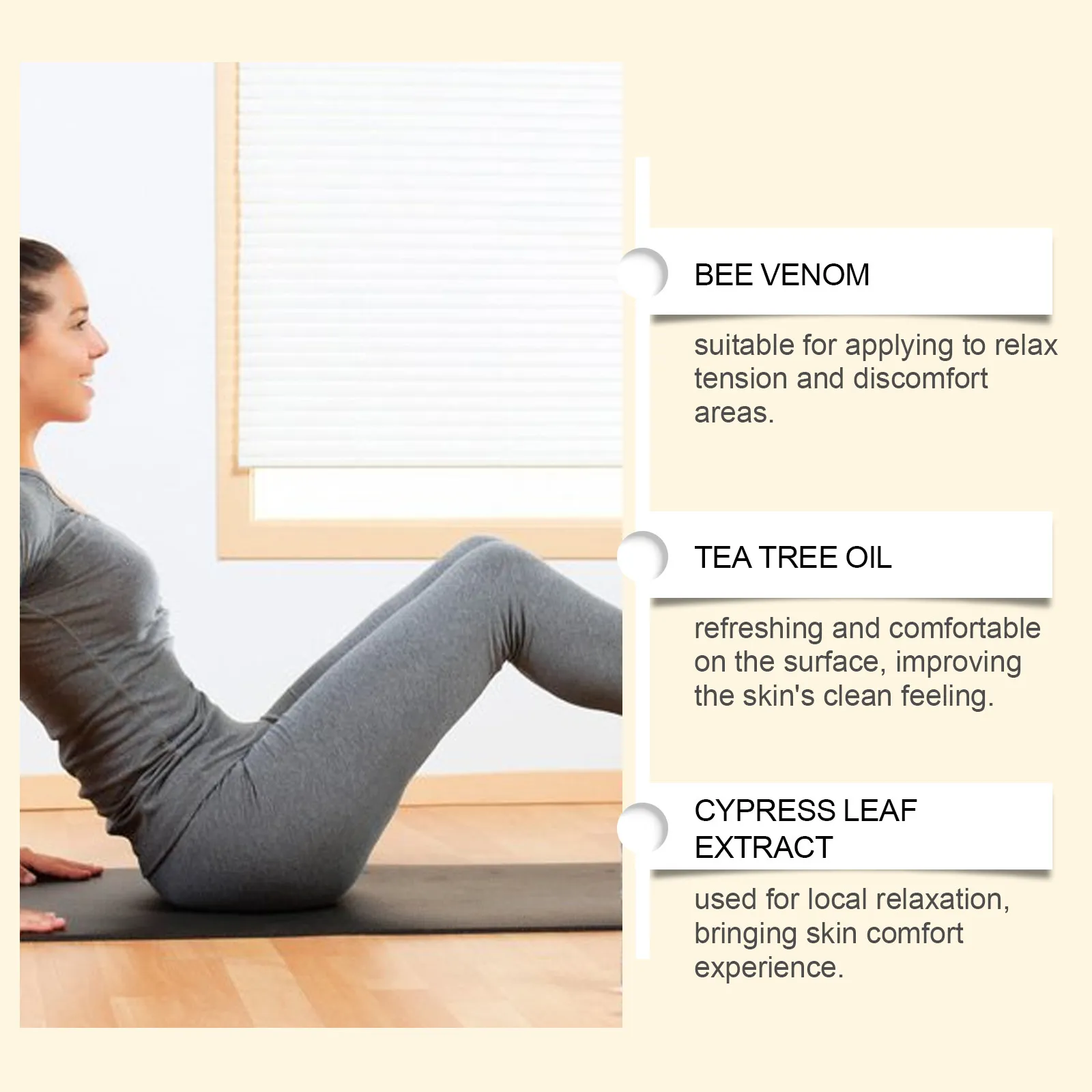 Active ingredients:Mint leaf. Bee venom, tea tree oil, Cypress leaf extract
