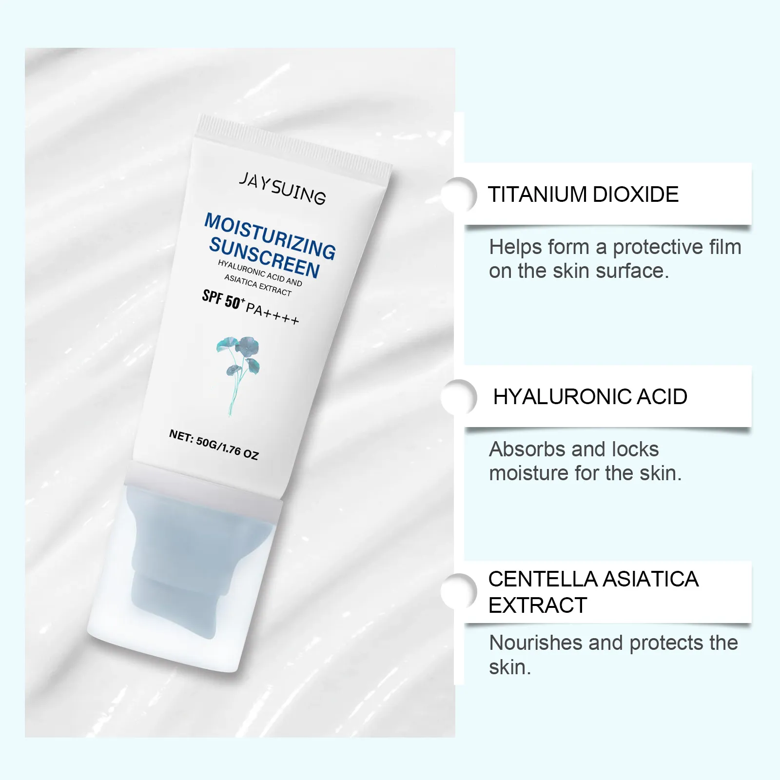 Ingredients :Water, Titanium Dioxide, Ethyl Hexyl Methoxycinnamate, Isononyl Isonononate, Glyceryl Stearate, 1,2-hexanediol, Asiatic