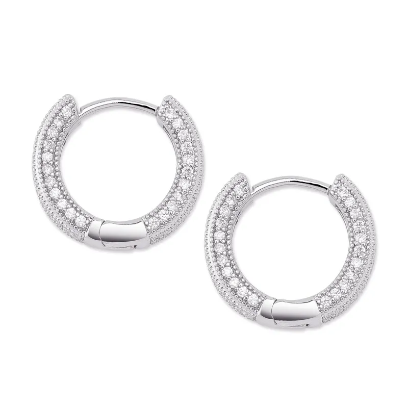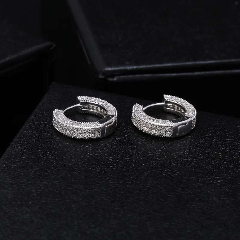 The hoop earrings are meticulously crafted with high-quality zircon stones that cover the entire surface, providing a radiant and luxurious look. The intricate placement of stones ensures consistent brilliance from every angle.