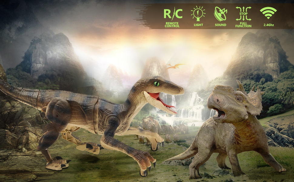 - Dinosaur fossil remote controller - Contains a super cool Dinosaur fossil remote controller.Press the head button to control the RC dinosaur move forward/backward,press the foot button to control the walking raptor turn left/right.Press the ‘AUTO DEMO’ button,this robot dinosaur will demonstrate a set of actions for your kids,Wagging his tail and roaring,move forward/ backward,turn right/ left,bring your kids into the dinosaur world at once.