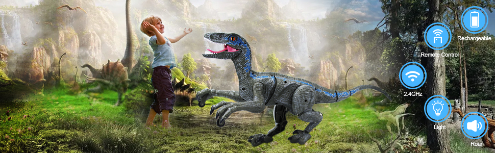 such as LED lights and roaring sound effects. With its 2.4GHz remote control system, kids can direct the dinosaur to walk,