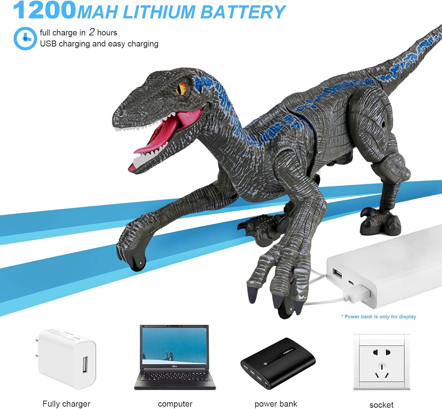 - Dinosaur Toys For Kids-Our electronic velociraptor is about 18.1’’L x 6.5’’H which built-in rechargeable lithium battery,it can be used continuously for 2 hours after being fully charged.This realistic robot dinosaur will spark your children's Hands-on ability & imaginative,and make away from electronics.It is for imaginative play,Birthday Party, Christmas, Holiday.Suitable for playing indoors or outdoors.