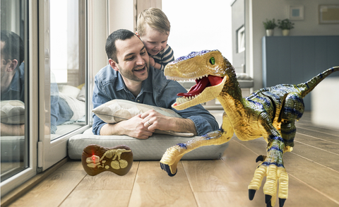 - Dinosaur fossil remote controller - Contains a super cool Dinosaur fossil remote controller.Press the head button to control the RC dinosaur move forward/backward,press the foot button to control the walking raptor turn left/right.Press the ‘AUTO DEMO’ button,this robot dinosaur will demonstrate a set of actions for your kids,Wagging his tail and roaring,move forward/ backward,turn right/ left,bring your kids into the dinosaur world at once.