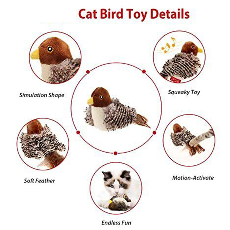 Squeaky Cat Toy:Â The feathered cat toy activates realistic bird sounds when touched, encouraging your cat's natural