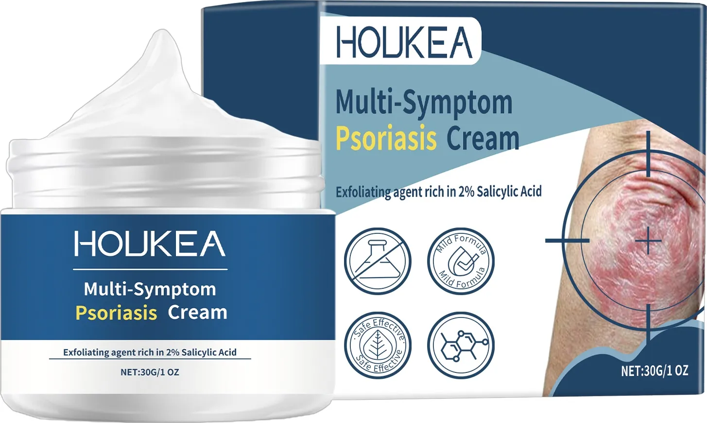HOUKEA Multi-Symptom Psoriasis Cream is formulated to help reduce the discomfort associated with psoriasis-affected skin. Infused with 2% salicylic acid, it works as an exfoliating agent to help soften and lift away dead skin buildup. This targeted formula is developed to help improve the appearance of dry, flaky, or scaly patches while promoting smoother-looking skin. The mild formula is crafted for safe and consistent use, with a focus on supporting sensitive, stressed, or irritated skin areas. HOUKEA’s blend is designed to help soothe visible symptoms while reinforcing hydration and comfort. It is suitable for users seeking a gentle topical option to help manage persistent rough patches, dryness, or surface texture irregularities.