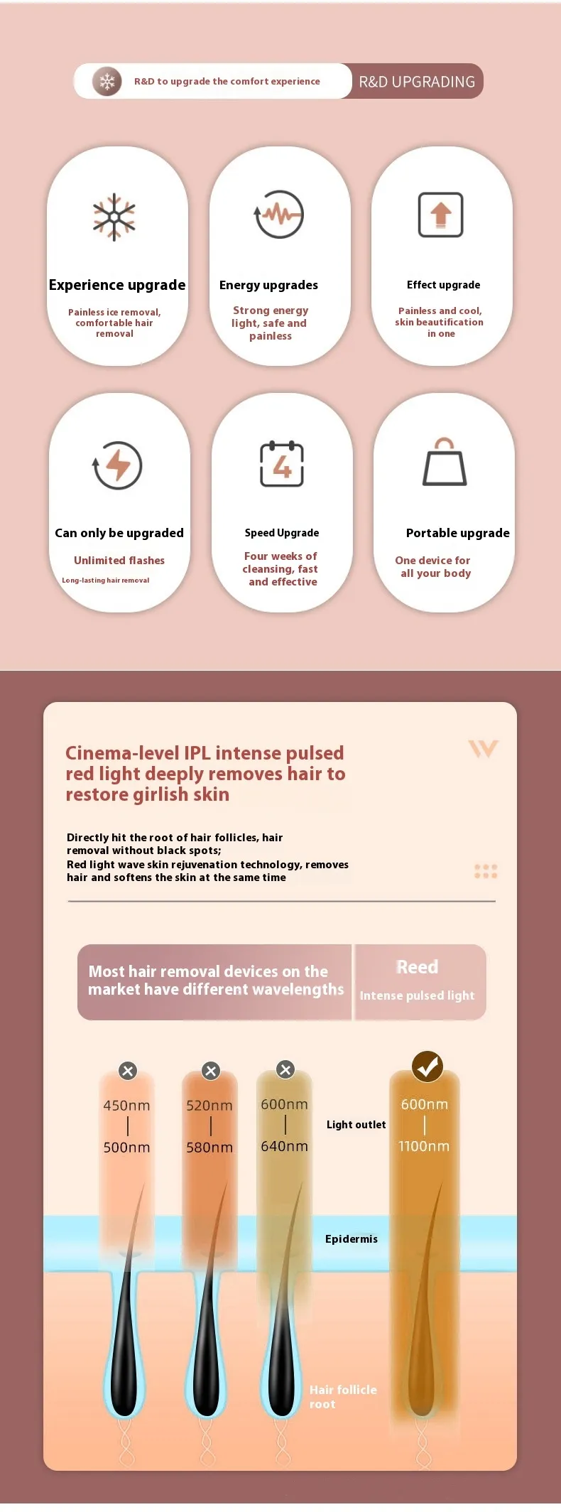Unlike traditional hair removal methods, such as waxing or shaving, the Household Freezing Point Laser Hair Removal Device ensures a virtually painless experience. The cooling effect of the freezing point technology helps numb the skin, making the process comfortable. It’s designed for users who want an effective yet gentle solution to hair removal.
