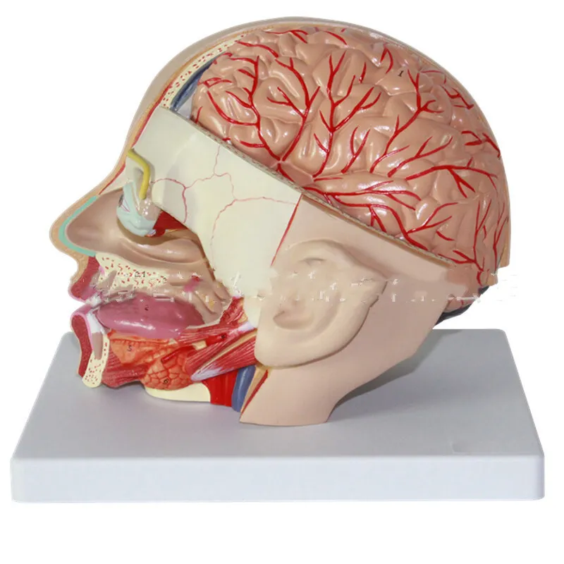 The head model is designed to offer a cross-sectional view, displaying the internal structures of the head, such as the nasal cavity, oral cavity, and the cranial cavity that houses the brain. This cross-sectional feature enables users to understand the spatial relationships between the brain, sinuses, and other head components. This is particularly useful in ENT (Ear, Nose, Throat) education, neurology, and other medical disciplines where a complete understanding of head anatomy is essential.