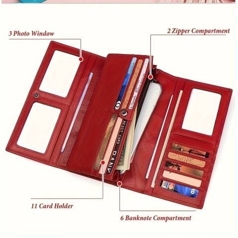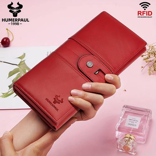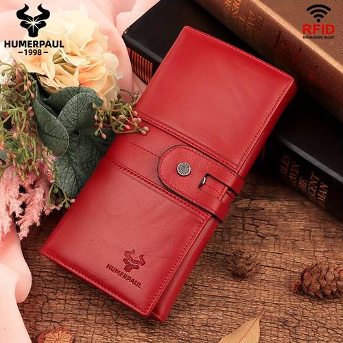 HUMERPAUL Women's Genuine Leather Wallet – Stylish Red Long Clutch with Multiple Card Slots and Zipper Pocket