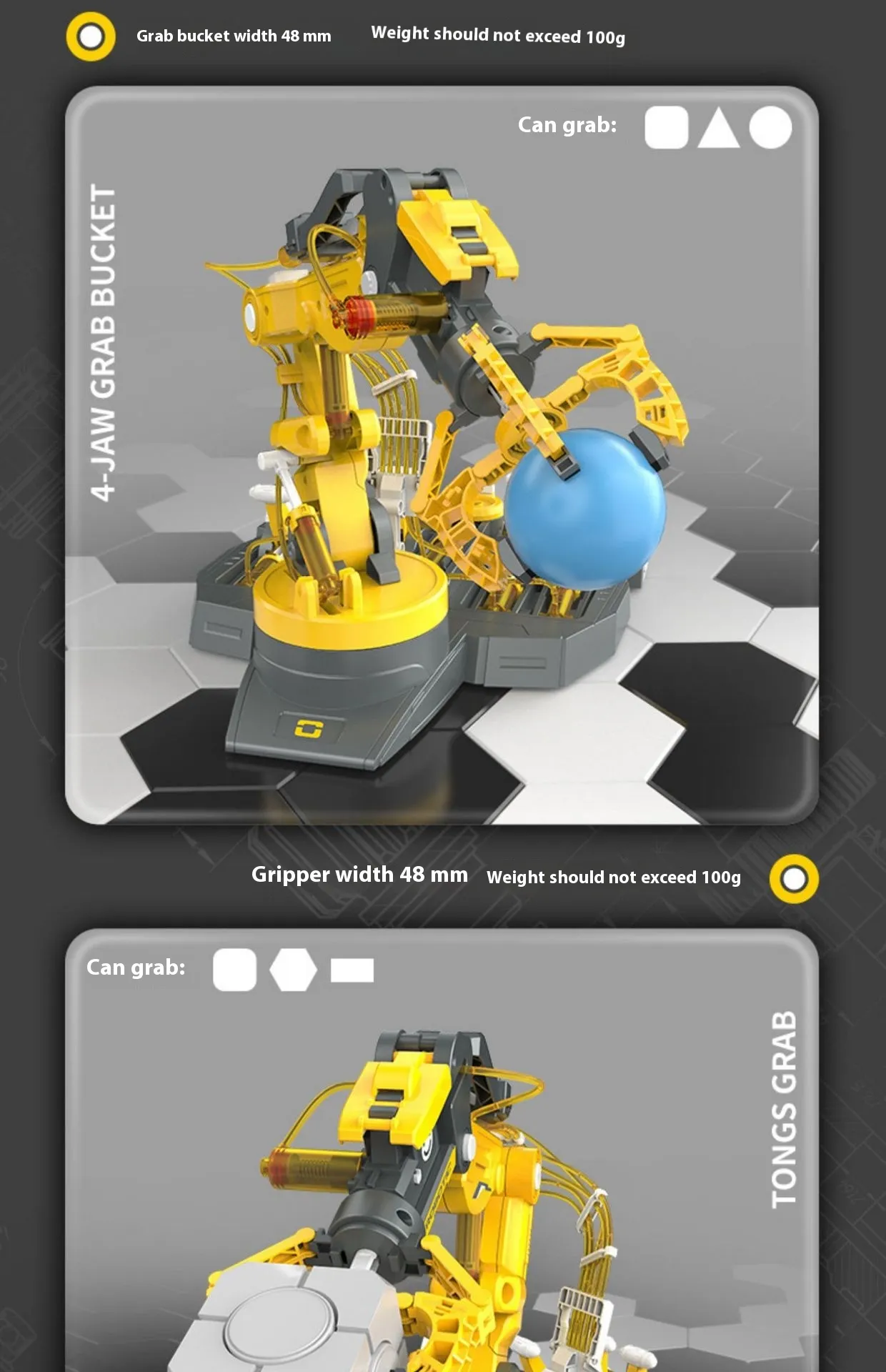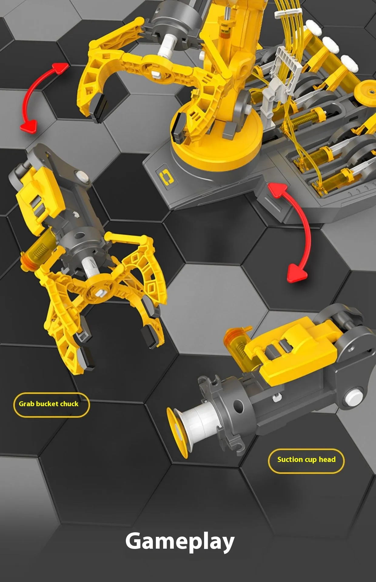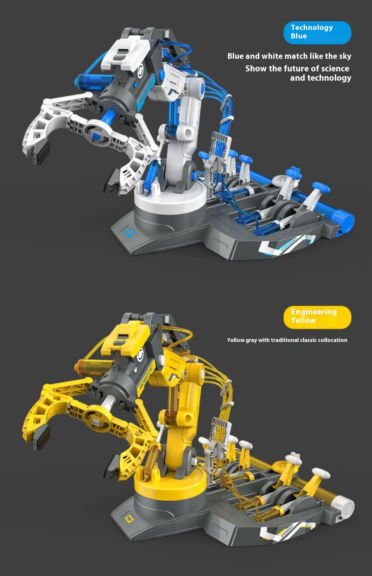 The hydraulic arm is designed to perform multiple movements, including gripping, lifting, rotating, and releasing objects, allowing kids to experience different aspects of mechanics and control. This versatility lets children experiment with various tasks, such as picking up items, rotating them, and placing them down. These capabilities introduce children to basic engineering concepts in an engaging and interactive way.