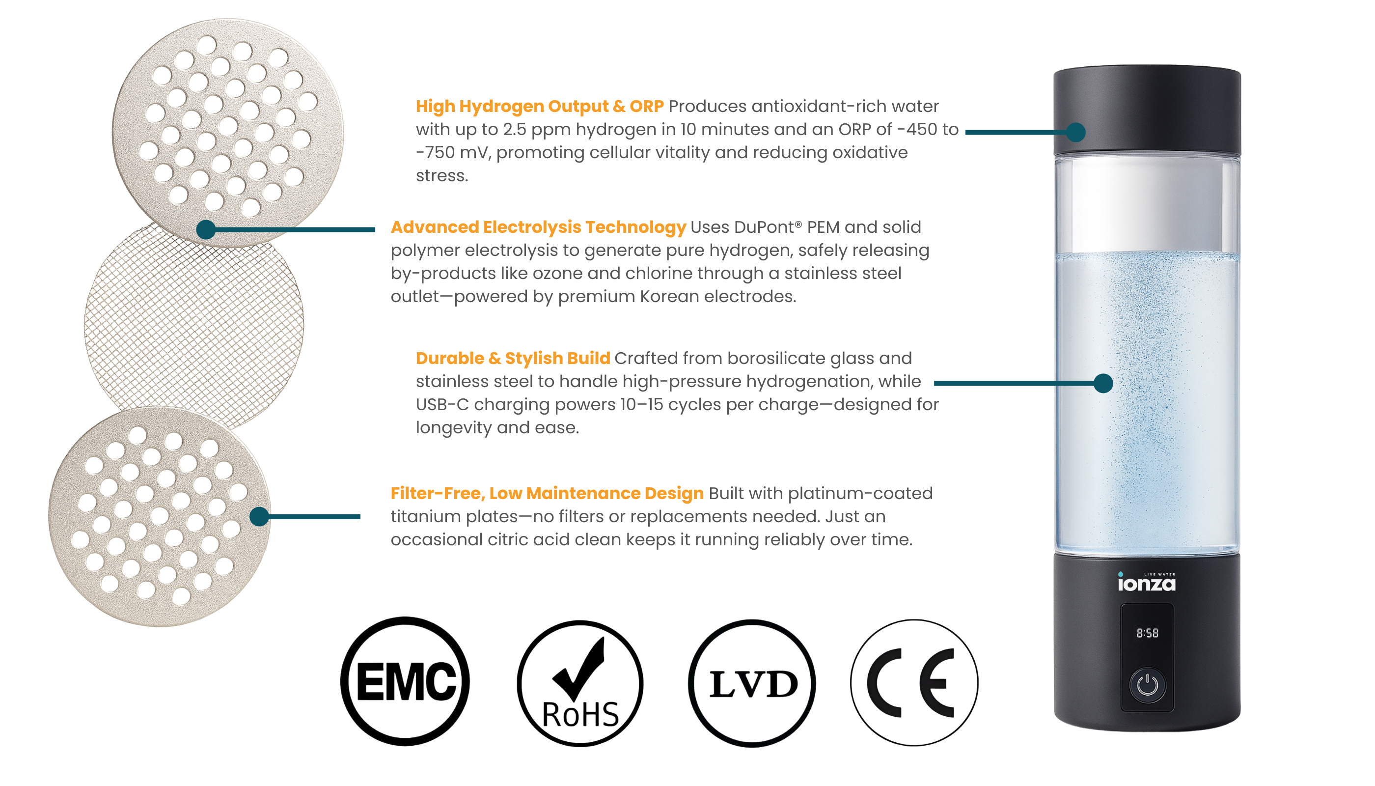 Unlike cheap hydrogen bottles with short lifespans, Ionza is designed for years of daily use. The internal PEM cell and electrode plates are engineered to resist mineral buildup, corrosion, and wear.