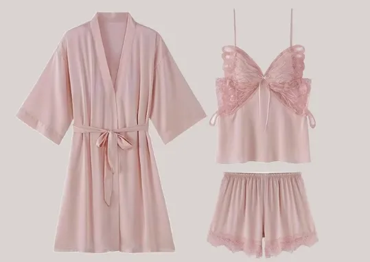 Color classification: Cherry Blossom Pink strappy shorts, cherry blossom pink nightgown, cherry blossom pink strappy shorts bathrobe, Cherry