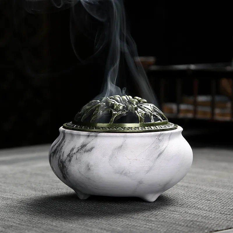 The imitation stone grain design adds a natural aesthetic to your space, making it an eye-catching addition to your home. The earthy tones and elegant alloy cover enhance its appearance, allowing it to fit in seamlessly with any home décor style. Whether placed on a side table, bookshelf, or countertop, this incense burner will serve as both a functional tool and a decorative piece.
