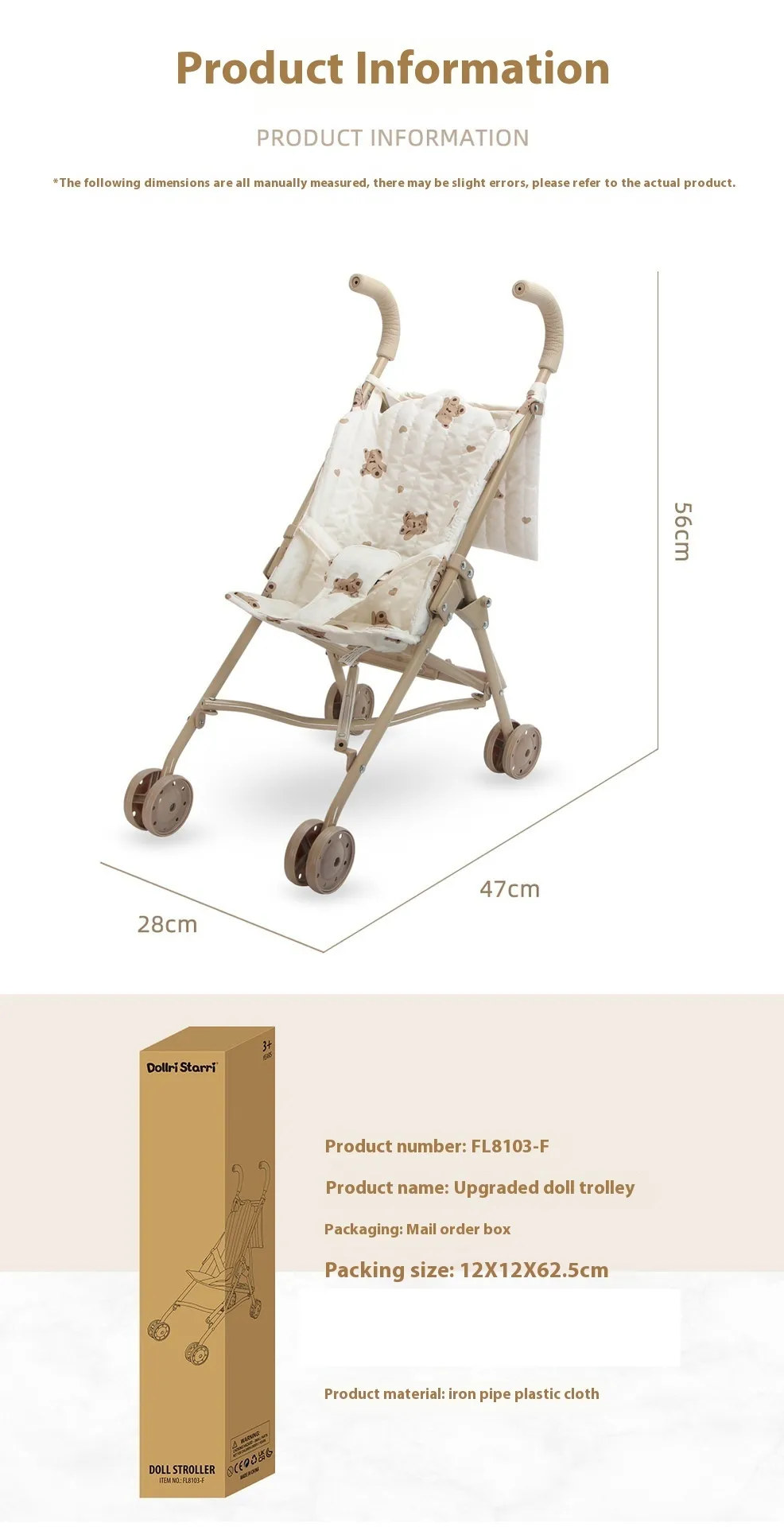 The standout feature of the Little Bear Doll Trolley is its cute and endearing bear design. With its soft bear ears, friendly face, and adorable details, the trolley adds a whimsical touch to any playtime. The plush fabric and high-end stitching make it both visually appealing and long-lasting, ensuring that it stays looking great after multiple uses.