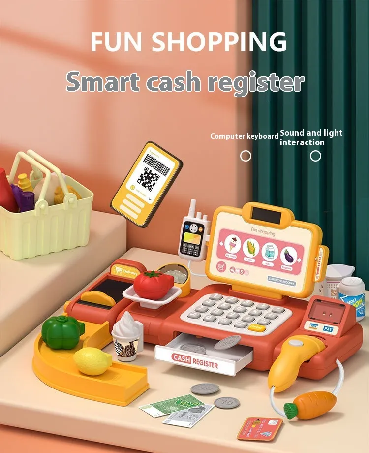 This toy cash register uses intelligent recognition technology to respond to actions, such as scanning items or inserting coins, bringing an
