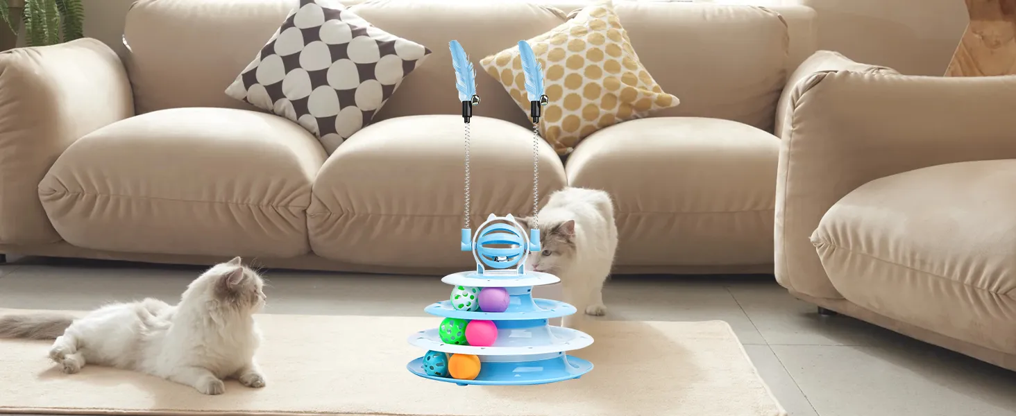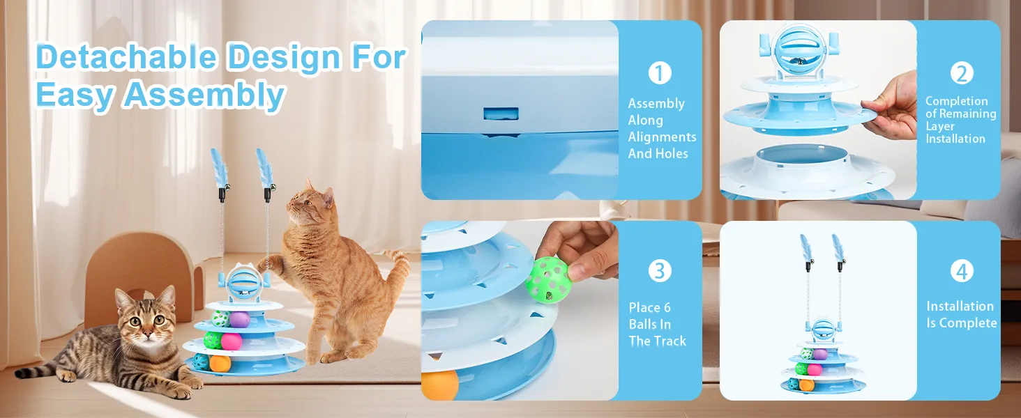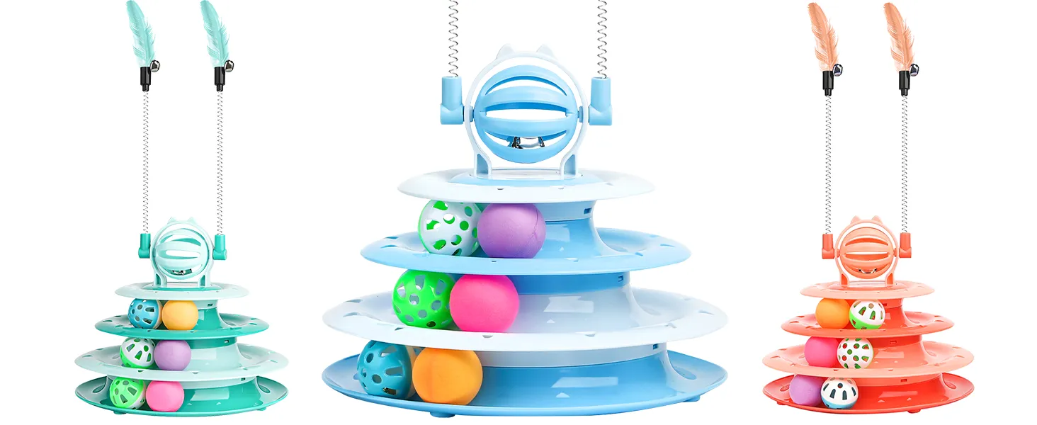Multi-functional Fun:Interactive Cat Toys are designed with a 4-tier carousel with 6 toy balls, and the top features a bell ball with 2 teasing rods, a variety of ways to play to mobilize your cat's vitality and release an abundance of energy;