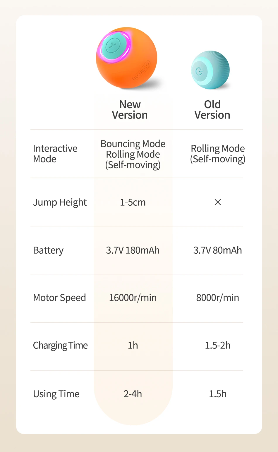 AÂ sleek, modern design that seamlessly integrates into your home decor, while simultaneously igniting your cat's natural instincts for exploration and play. Crafted with premium materials and cutting-edge technology, this bouncing ball boasts a mesmerizing self-moving feature that mimics the unpredictable movements of prey, instantly captivating your cat's attention and sparking their hunting instincts.