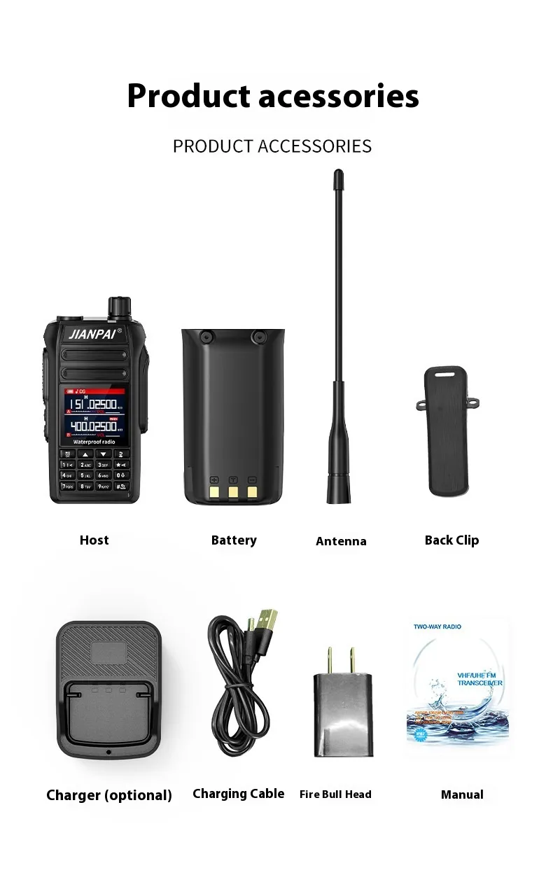 Host x1, battery x1, antenna x1, back clip x1, seat charger x1, charging cable x1, fire bull head x1, manual x1