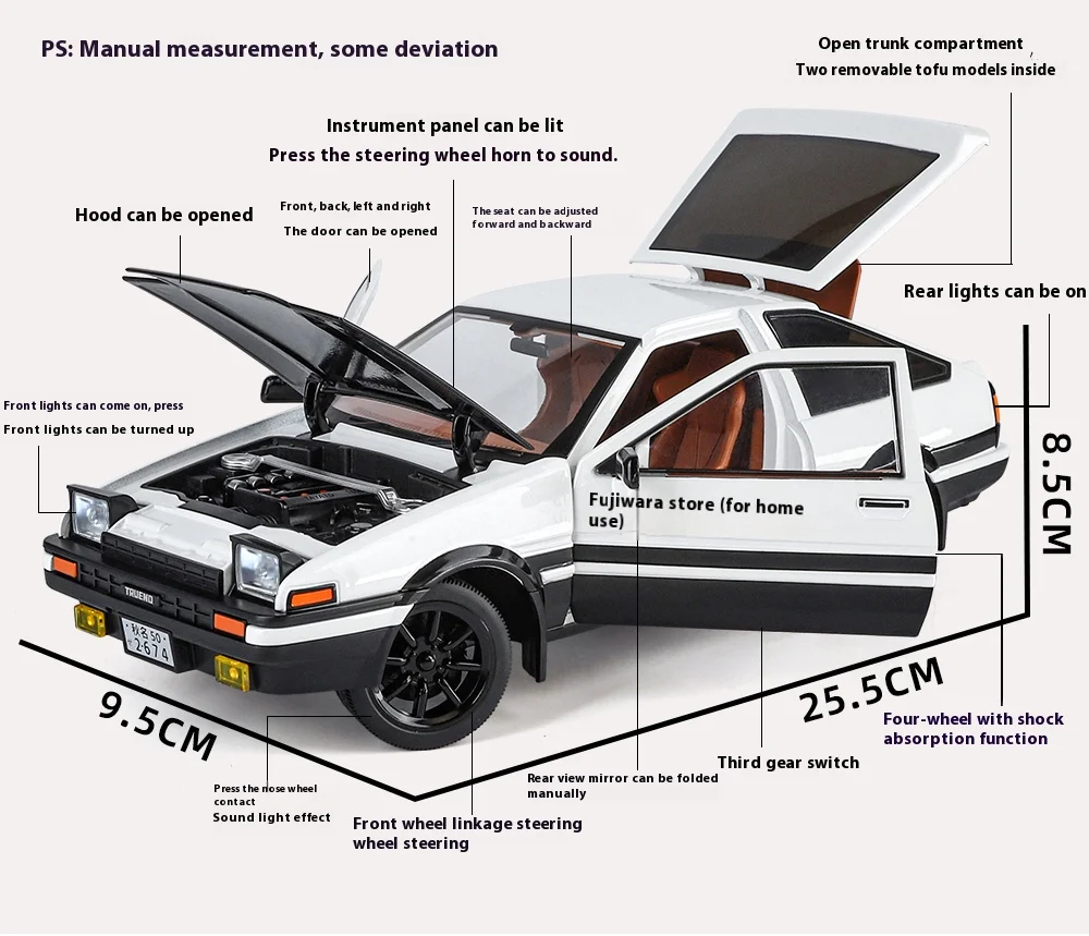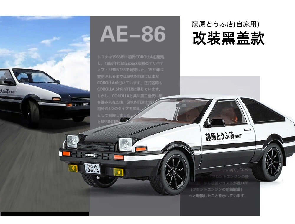If you want to relive the excitement of Initial D or simply appreciate the iconic design of the Toyota AE86, this diecast model car is an ideal addition to your collection. Don't miss out on this opportunity to own a piece of drift racing history.