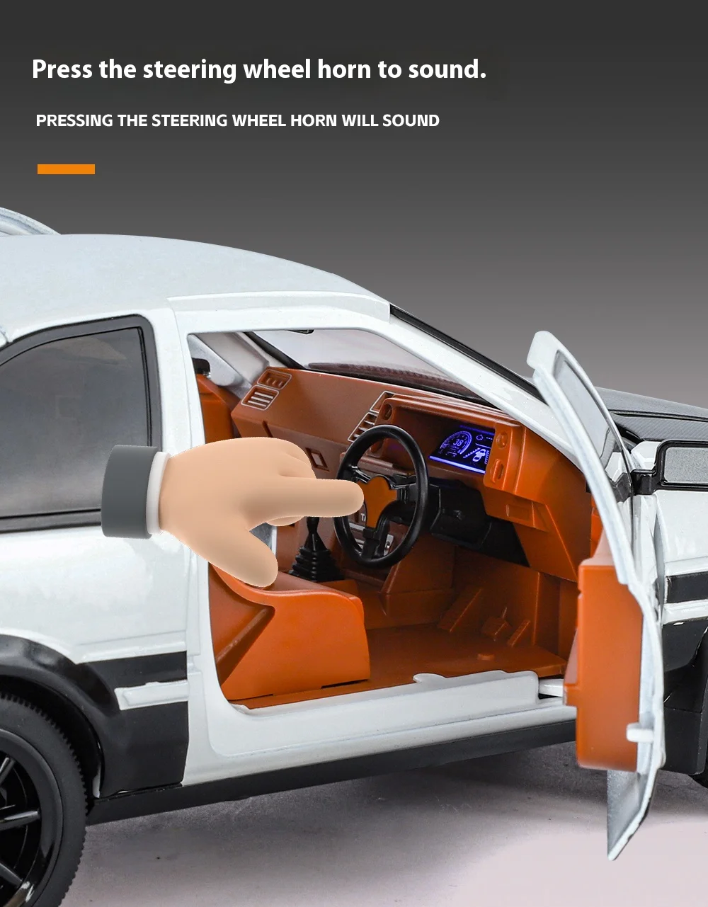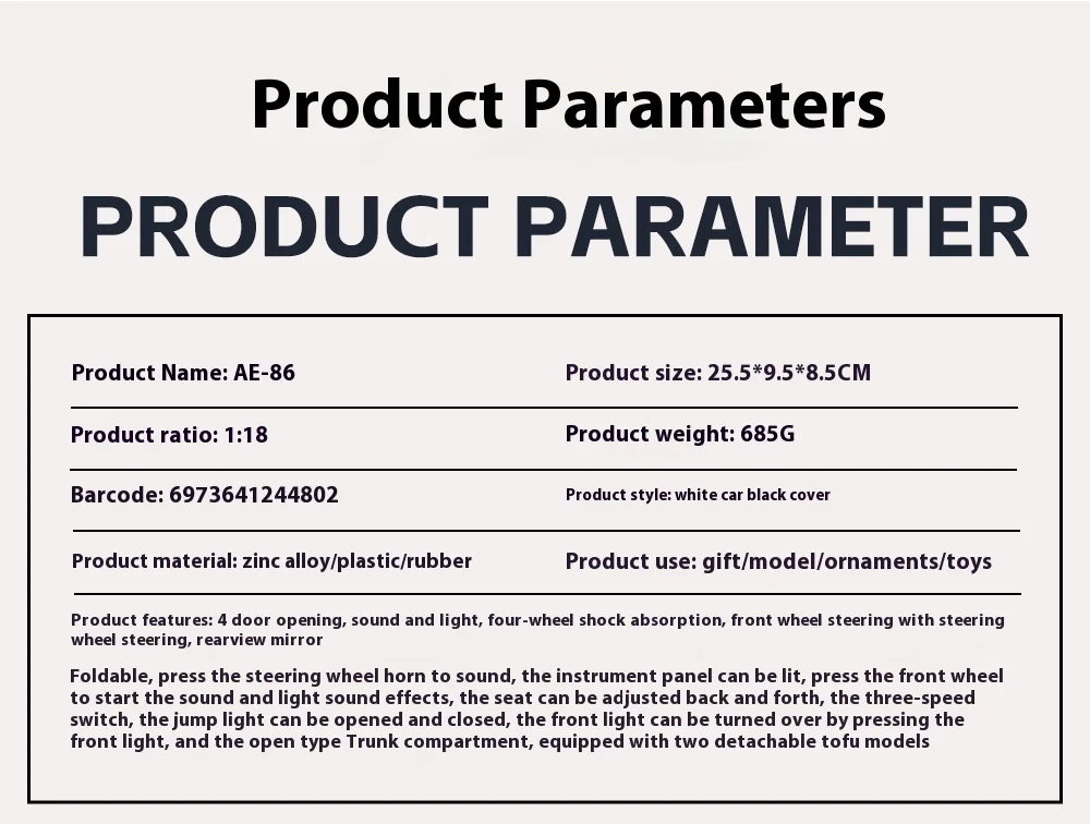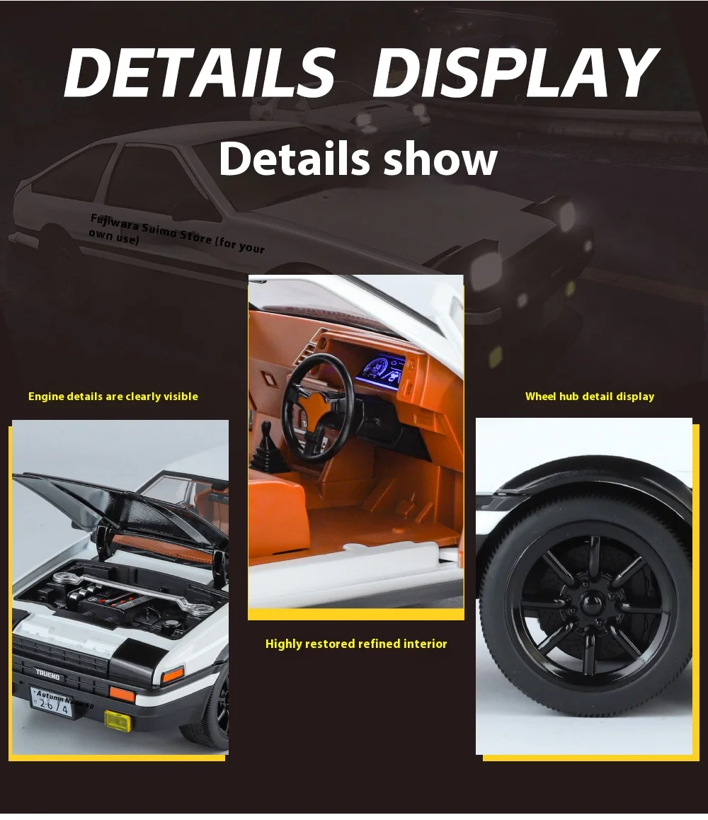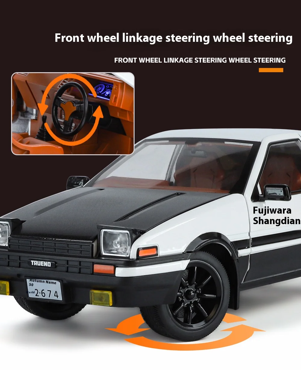 The JDM 1:18 Toyota AE86 TRUENO model car is carefully crafted to a 1:18 scale, which allows for an incredible level of detail. Every element of the car, from the exterior body to the fine interior features, is accurately reproduced to ensure that collectors and fans get a genuine feel for the iconic AE86 TRUENO. The model features realistic proportions, making it a perfect display piece for your desk, shelf, or collection.