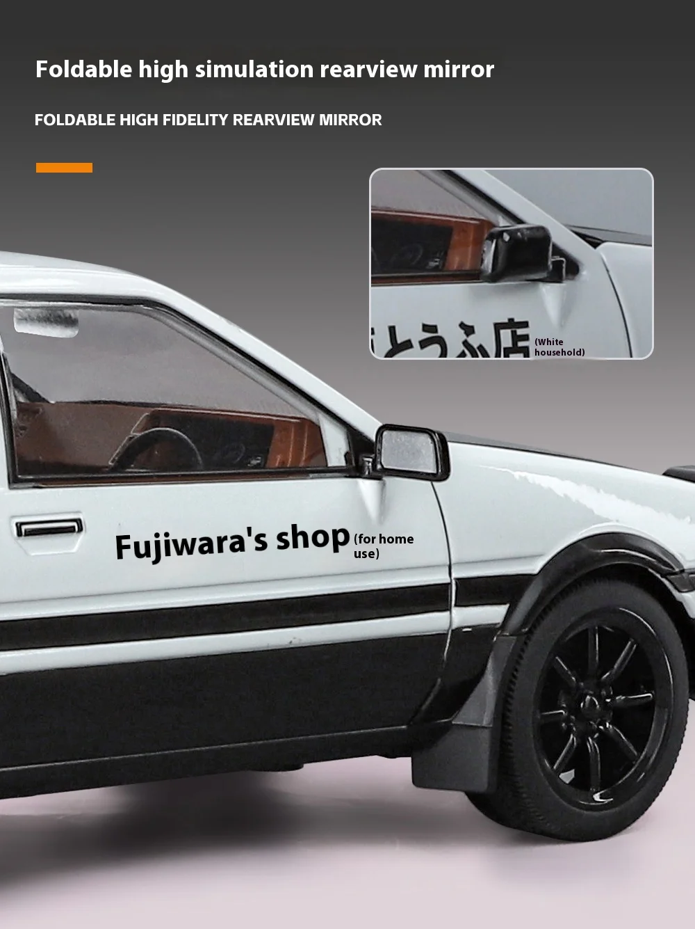 One of the standout features of this model is its detailed exterior. The car’s iconic white and black color scheme, as seen in the Initial D anime, is faithfully replicated, with special attention paid to the iconic TRUENO decals. The doors, hood, and trunk are fully functional, allowing collectors to open them and explore the interior, providing a fully interactive experience. The intricate wheel design, racing tires, and spoiler add to the realism of the model, making it an authentic representation of the car featured in the anime.