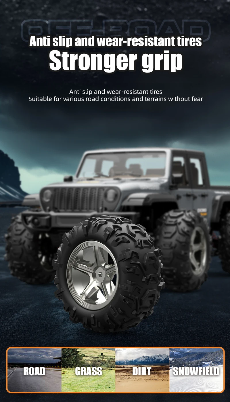The 4WD drivetrain ensures that the JJRC C8819 can tackle all kinds of terrains. Whether it's muddy trails, rough gravel, or rocky hills, this RC car is built to handle challenging conditions, making it perfect for off-road adventures.