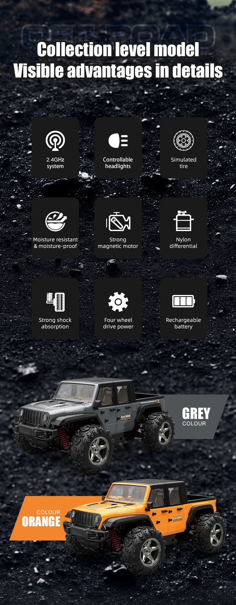 The JJRC C8819 1:20 Wrangler 4WD RC Car brings the thrill of off-roading right to your fingertips. With 4WD capabilities, LED lights, and a realistic full-scale design, this pickup truck RC toy is perfect for both adventure enthusiasts and those who love remote control cars. Whether you're racing on rocky trails, sand dunes, or just having fun around the yard, this Wrangler RC truck provides unmatched durability and performance. Its 2.4G remote control system ensures smooth, interference-free driving, making it suitable for both kids and adults who enjoy a bit of off-road action.